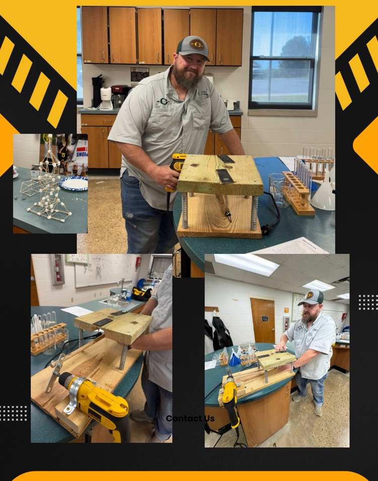 Mr. Bellomy at Ouachita School District is demonstrating an "Earthquake Test" with his Environmental Science class. Students were tasked to build an earthquake proof structure! Mr. Bellomy engineered the earthquake testing system himself!